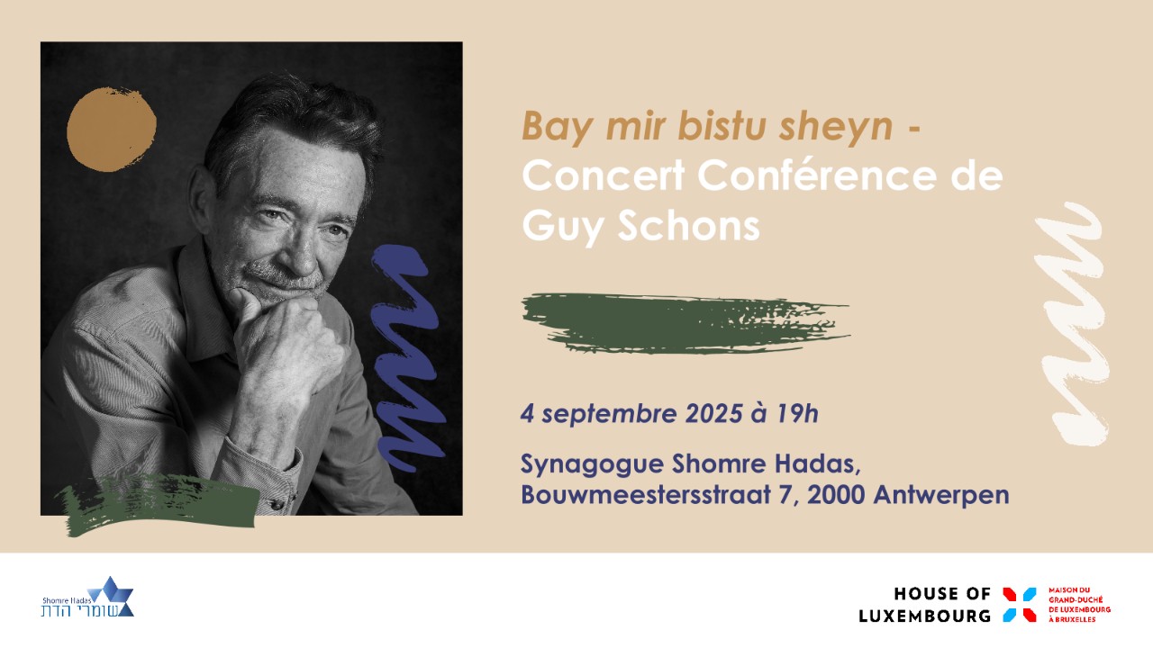 Lors de sa conférence musicale, le chanteur et historien luxembourgeois Guy Schons explorera l'histoire des Juifs au Luxembourg et les relations entre juifs et chrétiens en Europe depuis le Moyen Âge. Il présentera des mélodies expressives et mettra en évidence des parallèles avec des chansons populaires connues, illustrant ainsi les échanges et la cohabitation entre juifs et chrétiens. L’artiste explorera aussi les liens entre le yiddisch et le luxembourgeois. Guy Schons interprète des chansons yiddish telles que « Tumbalalaike », « Dona, Dona » et « Bay mir bistu sheyn». Il explique le contenu des chansons en anglais avant de les chanter.